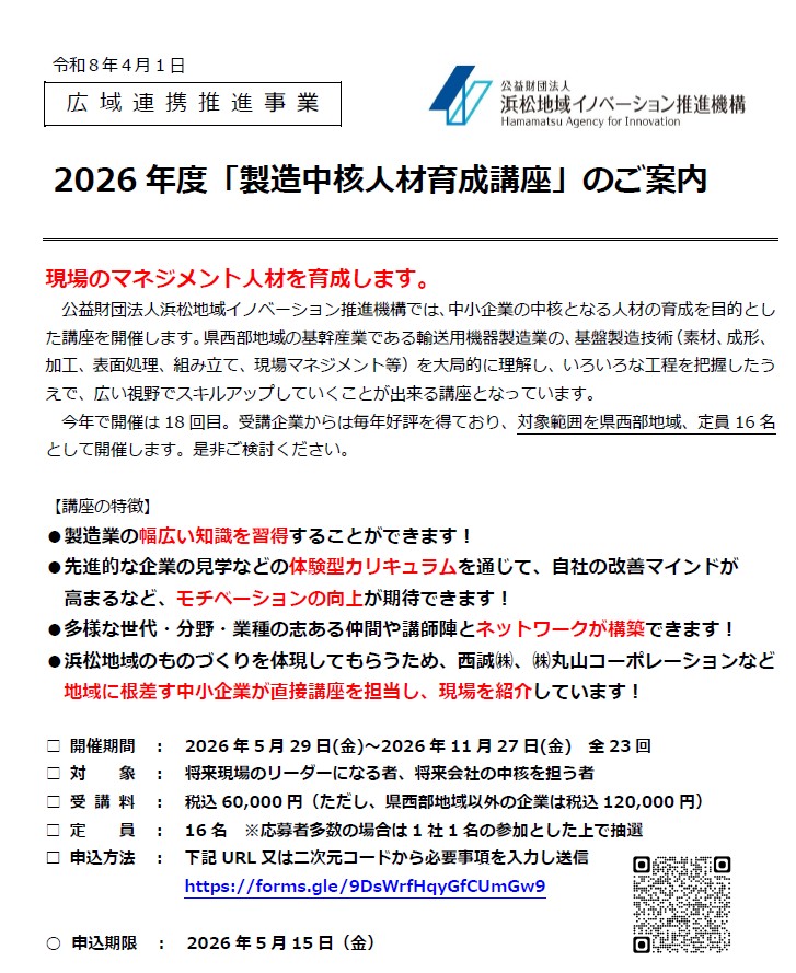 弊社もここ数年受入れ企業として参加している『製造中核人材育成講座』が今年度も開催されます。